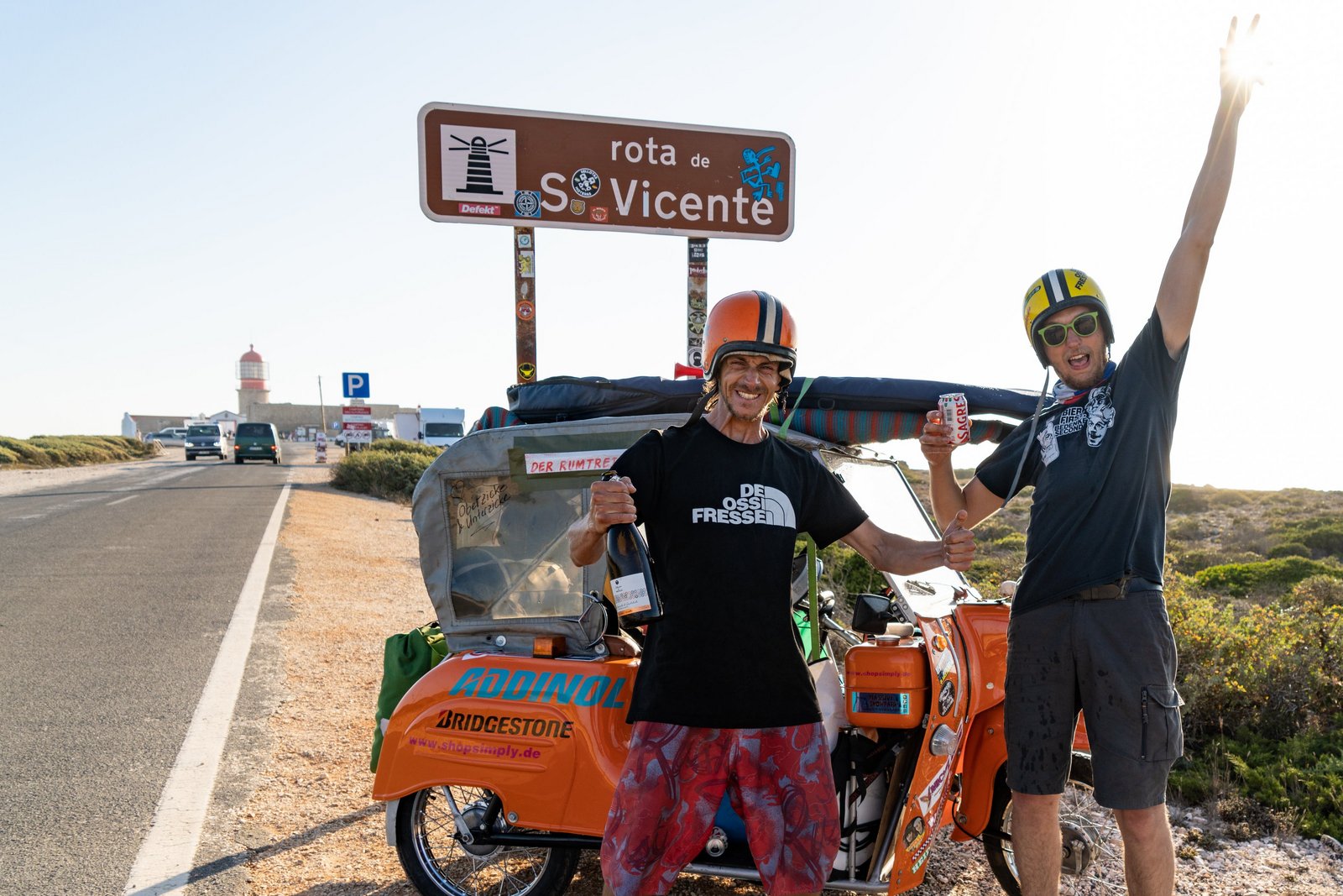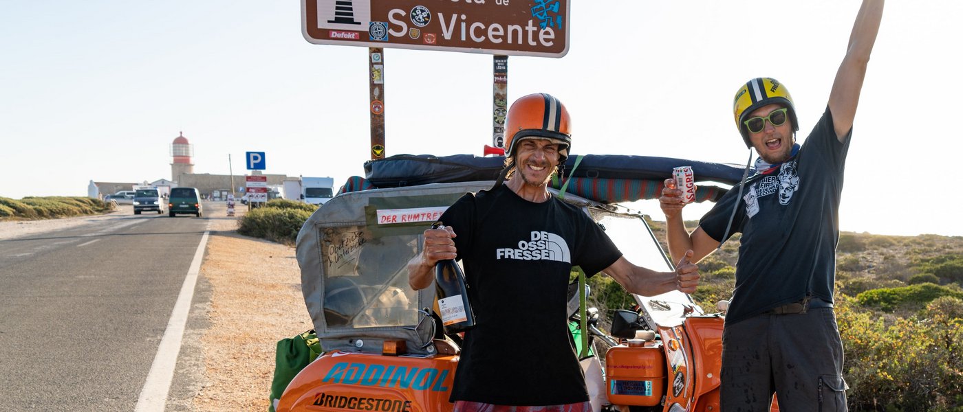 7.000 KM von Dresden bis Portugal auf drei Rädern - Ein Vorhaben, für das unsere Eltern und Freunde beim Anblick des Gefährts nur Kopfschütteln übrighatten. Nach dem schnellen Kauf und mehrtägigen Umbau der Krankenfahrstuhleinheit konnten wir am Abend des 21. Juni in den wilden Westen starten. Ohne eine Probefahrt gemacht zu haben und bepackt mit Surfbrettern, drei Unterhosen, zehn Litern Gemisch-Öl, Ersatzkanister und (wie immer) ohne Zelt, setzten wir zur ersten Etappe auf dem Weg zum Atlantik an.